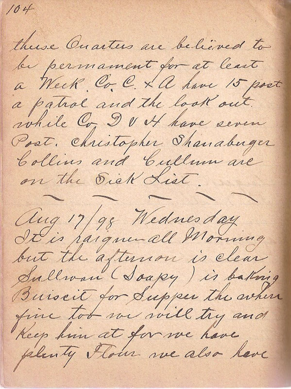 these Quaters are believed to be permament for at least a Week. Co C & A have 15 post a patrol and the look out while Co D & H have seven Post. christopher Shanaberger Collins and Cullman are on the Sick List.