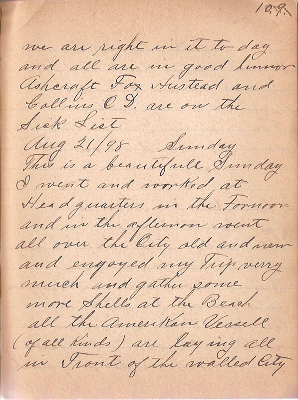 This is a beautifull Sunday I went and worked at Headquarters in the Fornoon and in the afternon went all over the City old and new and enjoyed my Trip verry much and gather some more Shells at the Beach all the Amerikan Vessell (of all Kins) are laying all in Front of the walled City |