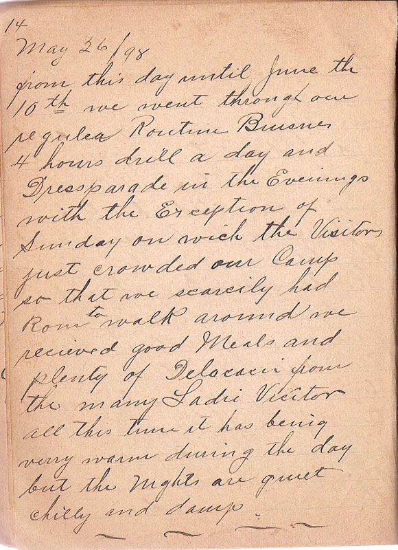 from this day until June the 10th we went through our regular routine Buisnes 4 hours drill a day and Dressparade in the Evenings with the Exception of Sunday on wich the Visitors just crowded our Camp so that we scarcily had Room to walk around we recieved good Meals and plenty of Delacasis from the many Ladie Visitor all this time it has being very warm during the day but the Nights are quiet chilly and damp |