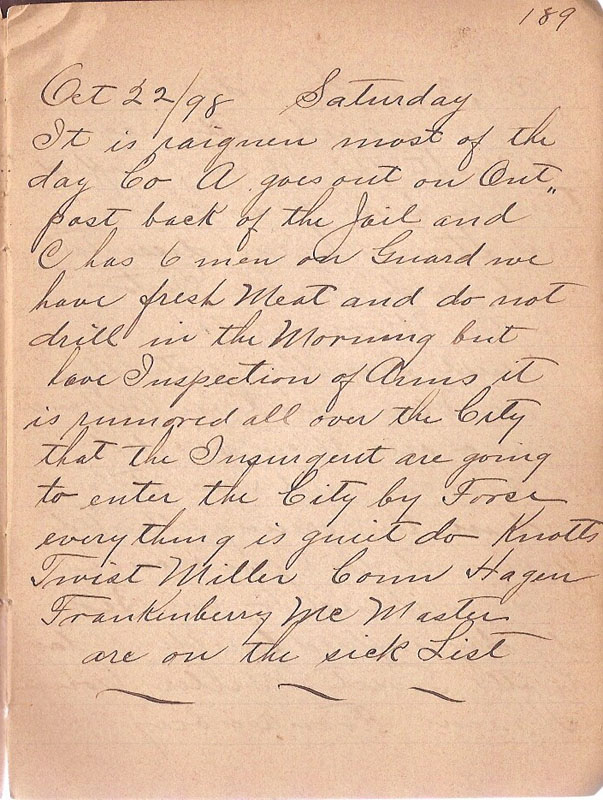 It is raignen most of the day Co A goes out on Outpostback of the Jail and C has 6 men on Guard we have fresh Meat in the Morning but have Inspection of Arms it is rumored all over the City that the Insurgent are going to enter the City by Forse everything is quiet do Knotts Twist Miler Conn Hagen Frankenbery McMaster are on the sick List |