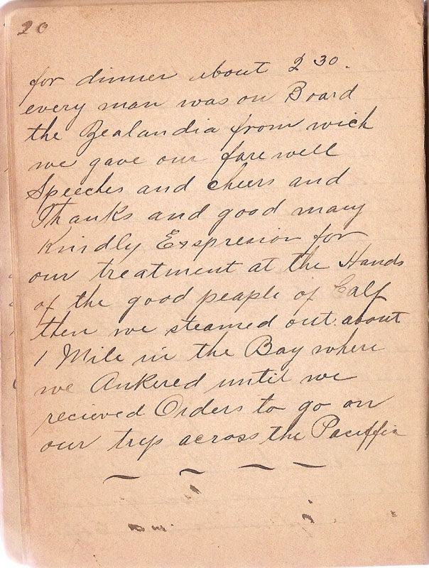 | for dinner about 230 every man was on Board the Zealandia from wich we gave our farewell Speeches and cheers and Thanks and good many kindly Expression for our treatment at the Hands of the good people of Calf then we steamed out about 1 Mile in the Bay where we Ankered until we recieved Orders to go on our trip across the Paciffic |