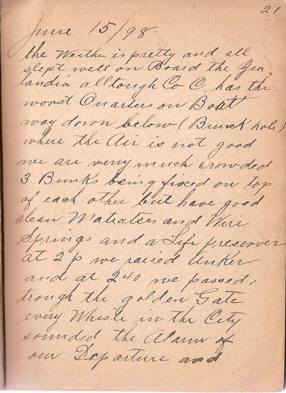 the Weather is pretty and all slept well on Board the Zealandia alltough Co C has the worst Quarters on Boat way down below (Bunck hole) where the Air is not good we are verry much crowded 3 Bunks being fisced on top of each other but have good clean Matratces and Wire Springs and a Life preserver at 2 p we raised Anker and at 240 we passed trough the golden Gate every Whisle in the City sounded the Alarm our Departure |