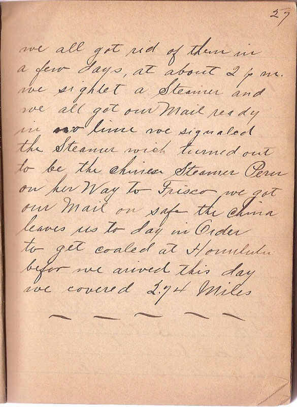 we all got rid of them in a few days, at about 2 pm we sighet a Steamer and we all got our Mail ready in no time we signaled the Steamer wich turned out to be the chinese Steamer Peru on her Way to Frisco we got our Mail on safe the china leaves us today in Order to get coaled at Honululu before we arrived this day we covered 274 Miles