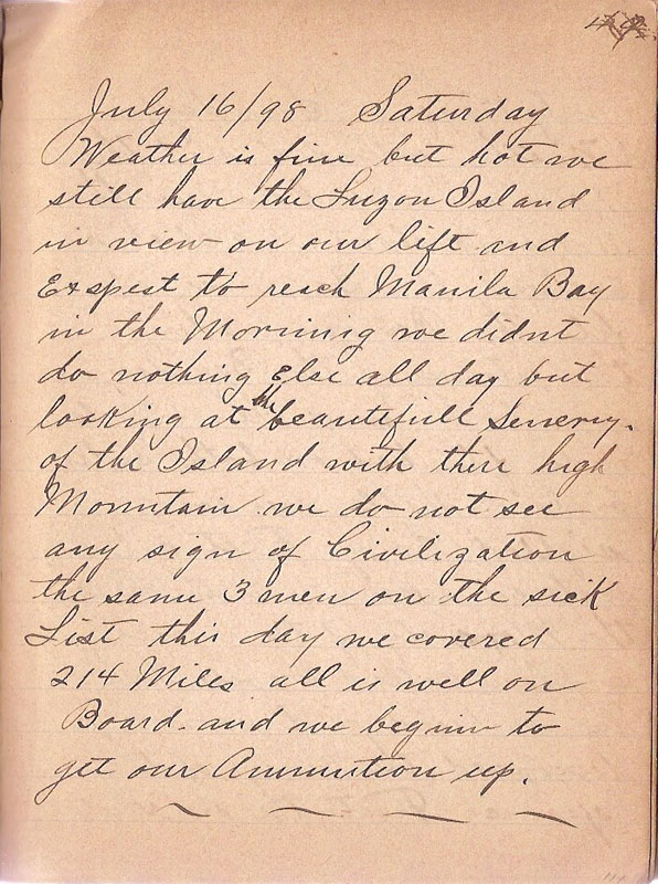 Weather is fine but hot we still have the Luzon Island in view on out left and exspect to reach Manila Bay in the Morning we didnt do nothing else all day but looking at the beautifull Senery of the Island with there high Mountain we do not see any sign of Civilization the same 3 men on the Sick List this day all is well on Board and we begin to get our Ammunition up |
