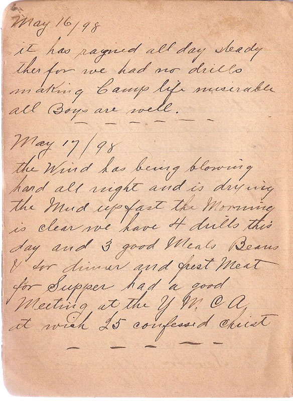 the Wind has being blowing hard all night and is drying the Mud up fast the Morning is clear we have 4 drills this day and 3 good Meals Beans for dinner and fresh Meat for Supper had a good Meeting at the YMCA at wich 25 confessed christ |