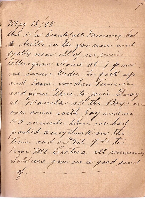 this is a beautifull Morning had 2 drills in the for now and pretty near all of us receive letters from Home at 7 pm we receive Orders to pack up and leave for SanFrancisco and from there to join Dewy at Manilla all the Boys are overcome with Joy and in 40 minutes time we had packed everythink on the train and are ready at 9:40 to leave Mt Gretna all remaining Soldiers gave us a good send of |