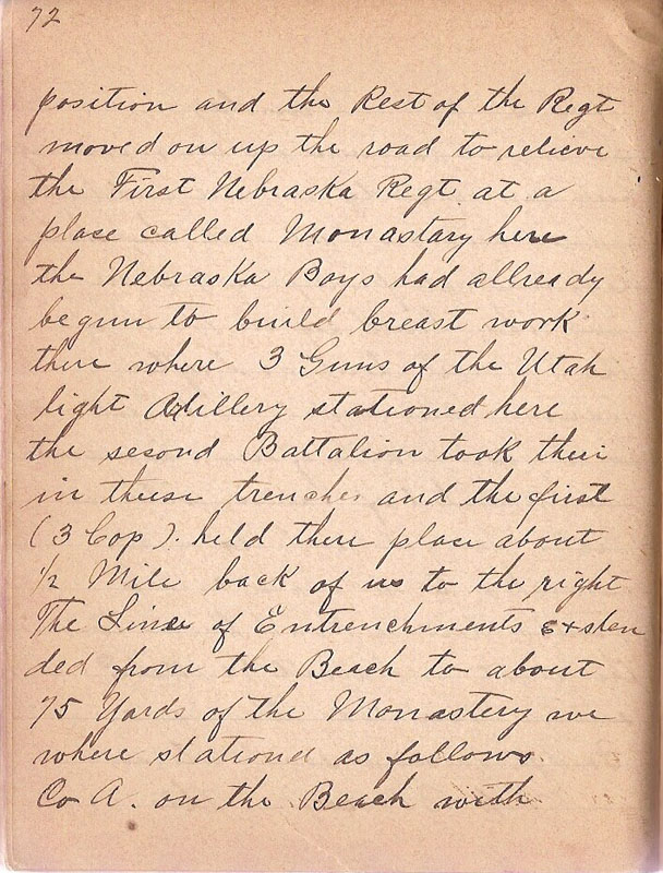 | position and the Rest of the Regt moved on up the road to relieve the First Nebraska Regt at a place called Monastary here the Nebraska Boys had allready begun to build breast work there where 3 Guns of the Utah light Artillery stationed here the second Battalion took their in theese trenches and the first (3 Cop) held there place about 1/2 Mile back of us to the right The Lines of Entrenchment exstended from the Beach to about 75 Yards of the Monastery we where stationed as follows Co A on the Beach with |