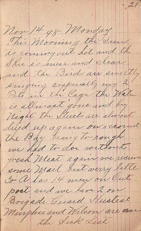 This Morning the Sun is coming out hot and the Skie is niece and clear and the Birds are sweetly singing exspecially my 2 Pets in the Cage the Water is allmost gone and by Night the Streets are almost dried up again on a clornet the Bay being to rough we had to do without fresh Meat again we receive some Mail but verry little Co A has 14 men on Outpost and we have 2 on Brigade Guard Hustead Murphie and Wilson are on the Sick List |
