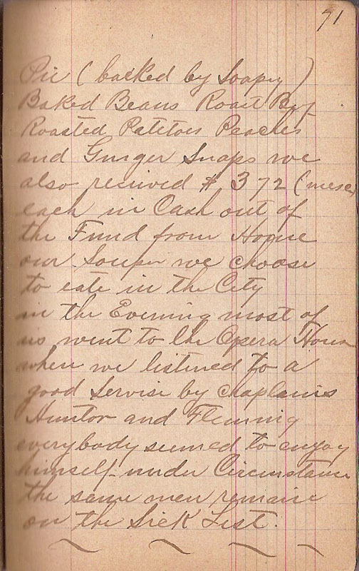Pie (backed by Soapy) Baked Beans Roast Beef Roasted Potatoes Peaches and Ginger Snaps we also recieved $372 (illegible – maybe "mese") each in Cash out of the Fund from our Hopice our Souper we choose to eat in the City in the Evening most of us went to the Opera House where we listened to a good Servise by Chaplains Huntor and Fleming everybody seemed to enjoy himself under Circumstance the same men remain on the Sick List |
