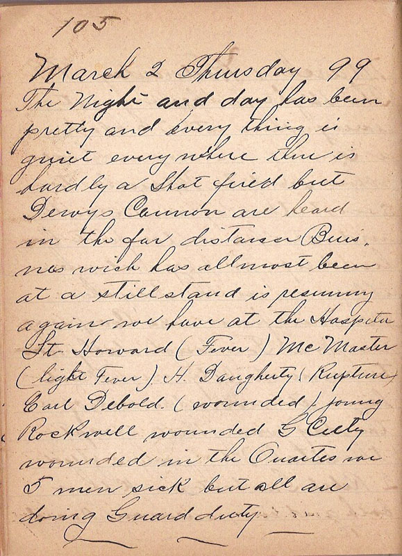 The Night and day has been pretty and every thing is quiet every where there is hardly a Shot fired but Dewys Cannon are heard in the far distance Buisnes wich has allmost been at a stillstand is resuming again we have at the Hospital Lt Howar (Fever) McMaster (Light Fever) H. Daugherty (Rupture) Carl Debold (wounded) Jourg Rockwell wounded G Cuty wounded in the Quarter we 5 men sick but all are doing Guard duty |