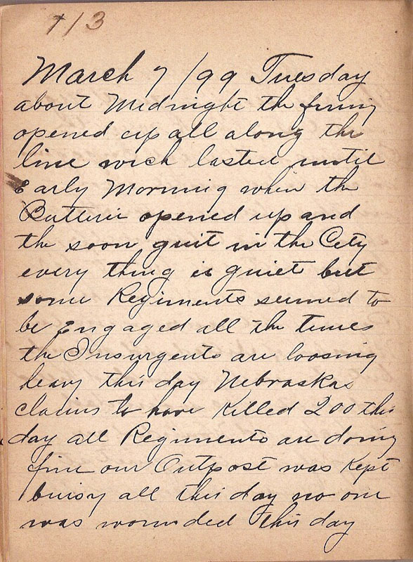 about Midnight the firing opened up all along the line wich lasted until easrly Morning when the Batterie opened up and the soon quit in the City every thing is quiet but some Regiments seemed to be engaged all the times the Insurgents are loosing heavy this day Nebraska claims to have Killed 200 this day all Regiments are doing fine our Outpost was Kept buisy all this day no one was wounded this day