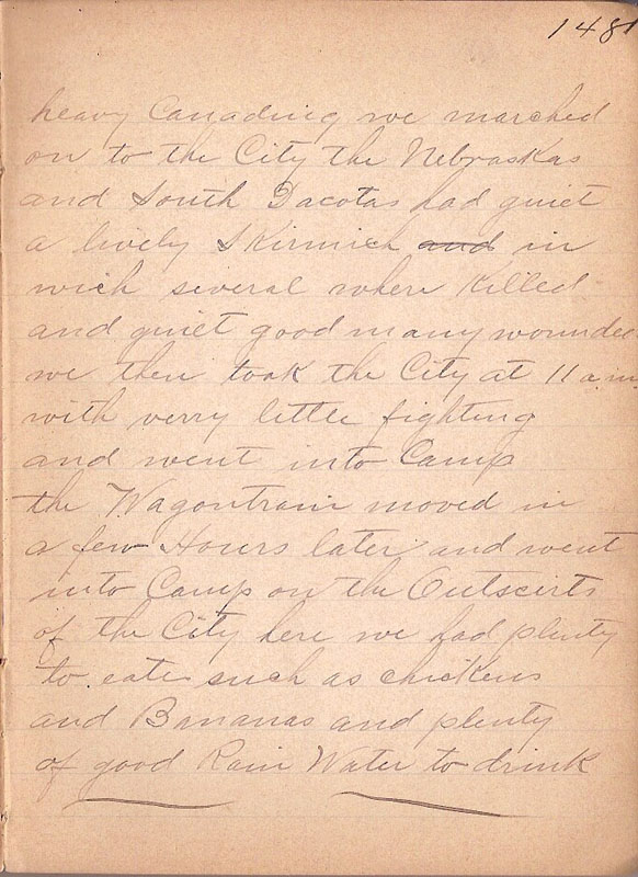| heavy canading we marched on to the City the Nebraskas and South Dacotas had quiet a lively Skirmich in wich several where Killed and quiet good many wounded we then took the City at 11 a.m. with verry little fighting and went into Camp the Wagontrain moved in a few Hours later and went into Camp on the Outscirts of the City here we had plenty to eat such as chickens and Bananas and plenty of good Rain Water to drink |