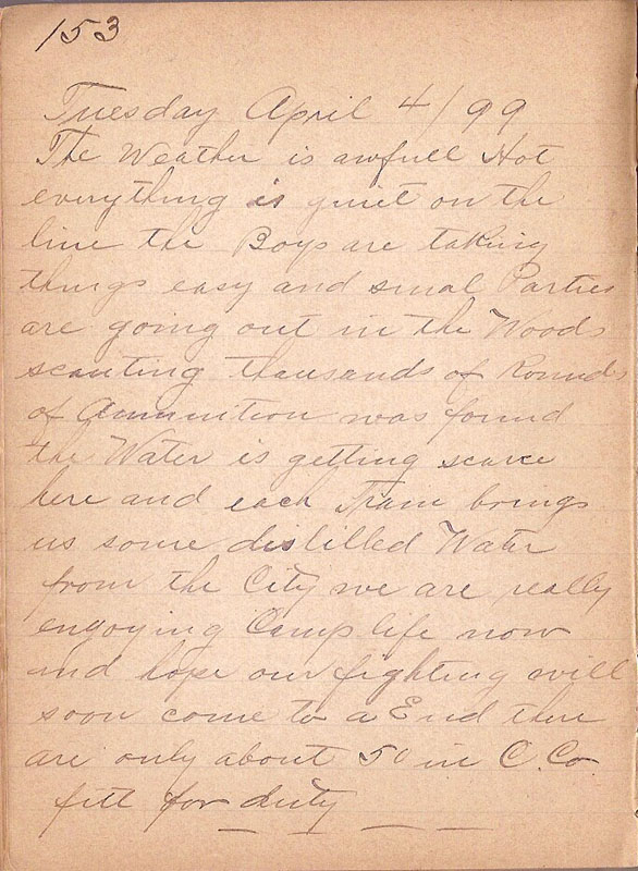Weather fine Co C. & D. came in from Outpost at 6 a.m. the 4th Cav went out scouting in the Mountains Two large Krup Guns where found buried in the Streets of the City and 3 more it said are buried some where in the afternoon we went in Swimming in the River and most of us washed our Clothes the Train made 2 trips to Manila carrying the death and wounded with them |