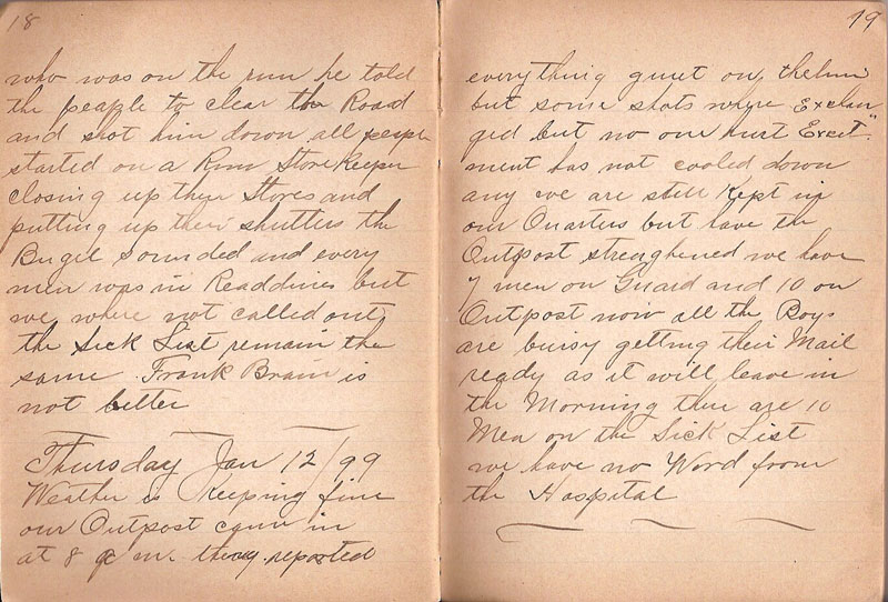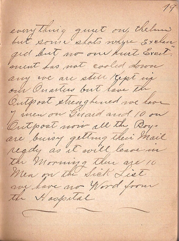 everything quiet on thelm but some shots where exchanged but no one hurt Excitment has not cooled down any we are still Kept in our Quarters but have the Outpost strenghened we have 7 men on Guard and 10 on Outpost now all the Boys are buisy getting their Mail ready as it will leave in the Morning their are 10 Men on the Sick List we have no Word from the Hospital |