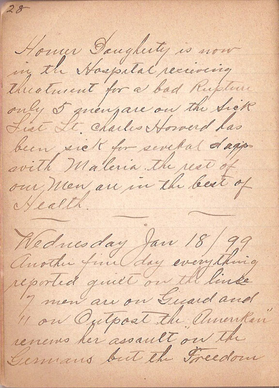 Homer Daugherty is now in the Hospital recieving threatment for a bad Rupture only 5 men are on the Sick List Lt Charles Howard has been sick for several days with Malaria the rest of our Men are in the best of Health