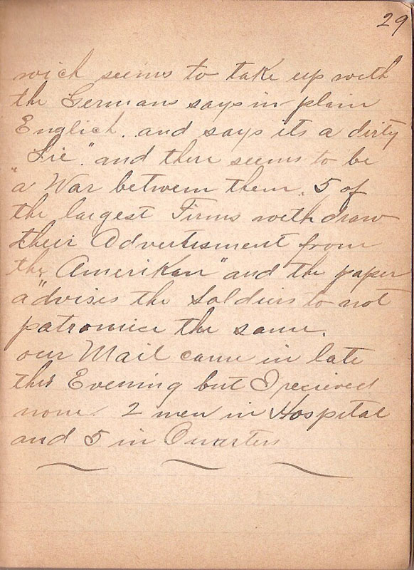 wich seems to take up with the Germans says in plain English and says its a dirty "Lie" and there seems to be a War between them 5 of the largest Firms with draw their Advertisment from the "Amerikan" and the paper advises the Soldiers to not patronice the same our Mail came in late this Evening but I recieved none 2 men in Hospital and 5 in Quarters |