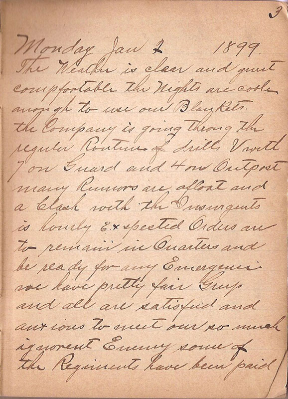 The Weather is clear and quiet compfortable the Nights are cool anough to use our Blankets the Company is going throug the regular Routine of drills & with 7 on Guard and 4 on Outpost many Rumors are afloat and a Clash with the Insurgents is hourly exspected Orders are to remain in Quarters and be ready for any Emergencie we have pretty fair Grup and all are satisfied and anxious to meet our so much ignorent Enemy some of the Regiment have been paid |