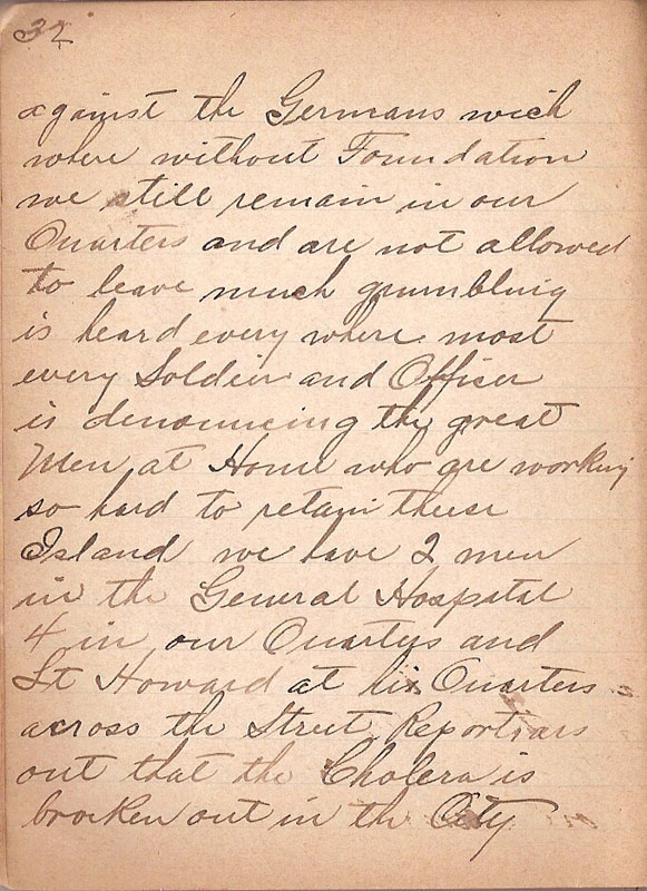 | against the Germans wich where without Foundation we still remain in our Quarters and are not allowed to leave much grumbling is heard where most every Soldier and Officer is denouncing the great Men at Home who are working so hard to retain theese Island we have 2 men in the General Hospital and Lt Howard at his Quarters across the Street Reports are out that the Cholera is broken out in the City |