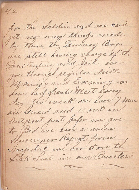| for the Soldier and we cant get no more things made by them the Tennesy Boys are still having charge of the Penitentury and Jail. we goe through regular drills Morning and Evening we have had fresh Meat every day this week we have 7 Men on Guard and 11 out on Outpost just befor we goe to Bed we have a mesi Shower no Report from Hospital we have 5 on the Sick List in our Quarters |