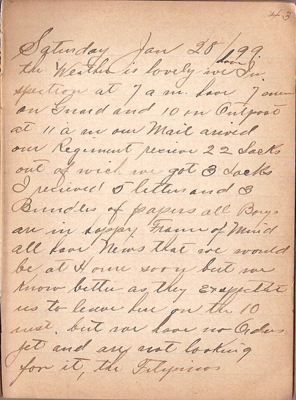 the Weather is lovely we have Inspection at 7 am have 7 men on Guard and 10 on Outpost at 11 am our Mail arived our Regiment recieve 22 Sacks out of wich we got 3 Sacks I recieved 5 letters and 3 Bundles of papers all Boys are in happy Frame of Mind all hear News that we would be at Home soon but we know better as they exspect us to leave here on the 10 rust but we have no Orders yet and are not looking for it the Filipinos |