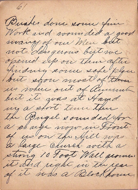 Bushes done some fine Work and wounded a good many of our Men but not dangerous but we opened up on them after finding some safe place but soon most of us where out of Ammunition but it was at Hand in a short time their the Bugel sounded for a charge now in Front of us on the Hill was a large church with a strong 10 Foot Wall around it and right in the rear of it was a Blockhouse |