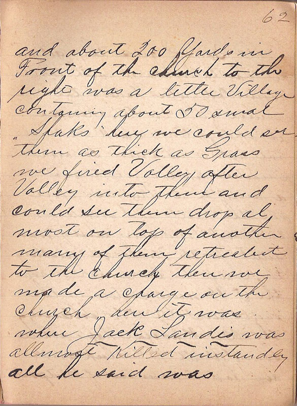| and about 200 Yards in Front of the church to the right was a little Village contaning about 50 smal "Shaks" here we could see them as thick as Grass we fired Volley after Volley into them and could see them drop almost on top another many of them retreatet to the church their we made charge on the church here it was where Jack Landis was allmost Killed instandly all he said was |