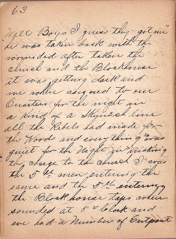 "well Boys I guess they got me" he was taken back with the wounded after taken the church and the Blockhouse it was getting dark and we where asigned to our Quaters for the night in a kind of Skirmish line all the Rebels had made for the Woods and everything was quiet for the Night in making the charge to the church I was the 5th men entering the same and the 5th entering the Blockhouse taps where sounded at 8 o Clock and we had a Number of Outpost |