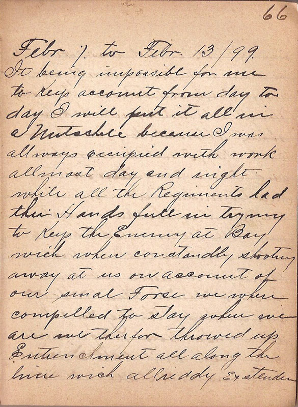It being impossible for me to keep account from day to day I will put it all in a Nutschell because I was always occupied with work allmost day and night while all the Regiment had their Hands full in trying to Keep the Enemy at Bay wich where constandly shooting away at us on account of our smal Forse we where compelled to stay where we are we therfor throwed up Entrenchment all along the line wich allready exstenden |