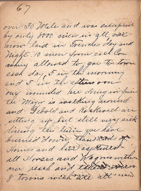 over 30 Miles and was occupied by only 8000 men in all we now laid in Trenches day and Night 10 men from each Co where alowed to goe to town each day 5 in the morning and 5 in the afternoon our wounded are doing in fine the Major is walking around and Debold and Rockwell are sitting up but still very sick during this time we have burned down thousands of Homes and have captured all Horses and Wagons within our reach and taken over 8 towns wich are all |