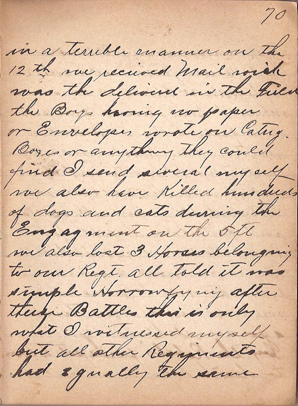 | in a terrible manner on the 12th we received Mail wich was the delivered in the Field the Boys having no paper or Envelopes wrote on Catrig. Boxes or anything they could find I send several myself we also have Killed hundreds of dogs and cats during the Engagement on the 5th we also lost 3 Horses belonging to our Regt all told it was simple Horrowfying after these Battles this is only what I witnessed myself but all other Regiments had equally the same |