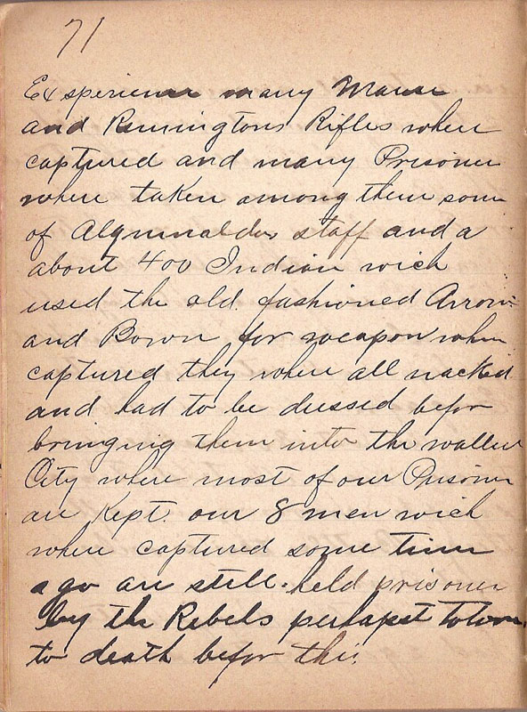 Exsperience many Marer and Remington Rifles where captured and many Prisoner where taken among them some of Alguinaldos staff and a about 400 Indian wich used the old fashioned Arrow and Bow for weapon when captured they where all nacked and had to be dressed befor bringing them into the walled City where most of our Prisoner are Kept our 8 men wich where captured some time a go are still held prisoner by the Rebels perhapst torture to death befor this |