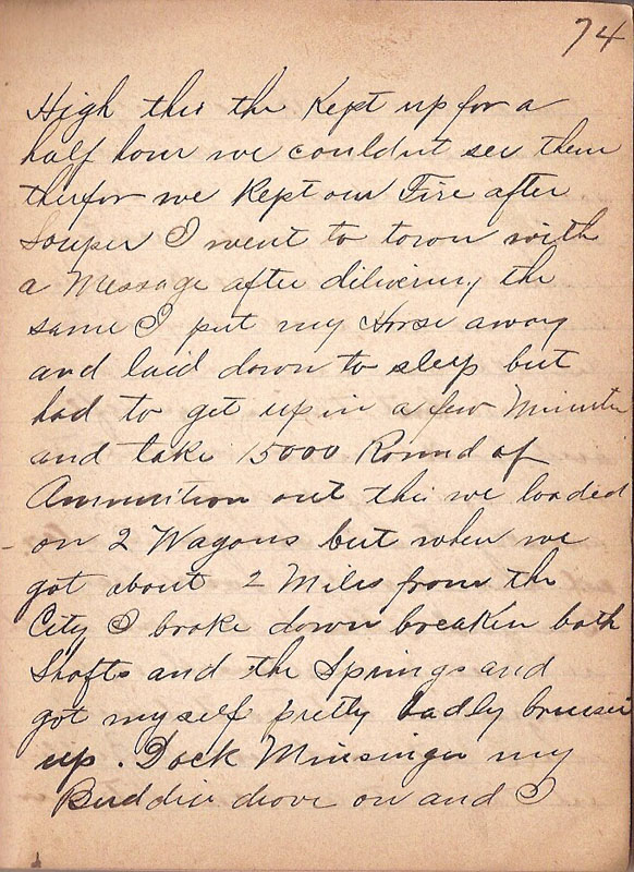 | High this the Kept up for a half hour we couldnt see them therefor we Kept our Fire after Souper I went to town with a Message after delivering the same I put my Horse away and laid down to sleep but had to get up in a few Minutes and take 15000 Rounds of Ammunition out this was loaded on 2 Wagons but when we got about 2 Miles from the City I brooke down breaken both Shafts and the Springs and got myself pretty badly bruised up Dock Minsinger my buddie drove on and I |