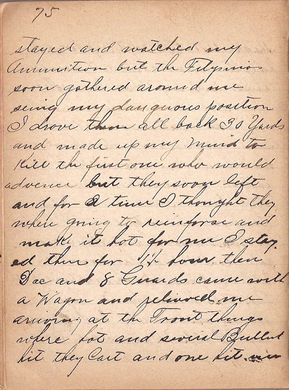 stayed and watched my Ammunition but the Filipinos soons gathered around me seeing my dangerous position I drove them all back 30 Yards and made up my mind to Kill the first one who would advance but they soon left and for a time I thought they where going to reinforce and make it hot for me I stayed their for 1½ hour then Doc and 8 Guards came with a Wagon and relieved me arriving at the Front things where hot and several Bullet hit they Cart and one hit me |