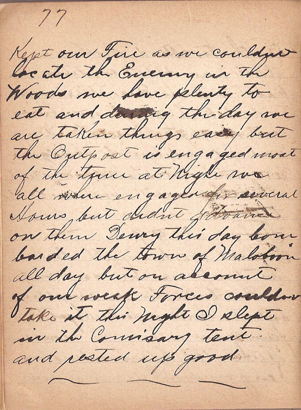 Kept our Fire as we couldnt locate the Enemy in the Woods we have plenty to eat and during the day we are taken things easy but the Outpost is engaged most of the time at Night we all where engaged for several Hours but didnt advance on them Dewy this day bombarded the town of Maloboon all day but on account of our weak Forces couldnt take it this Night I slept in the Comisary tent and rested up good |
