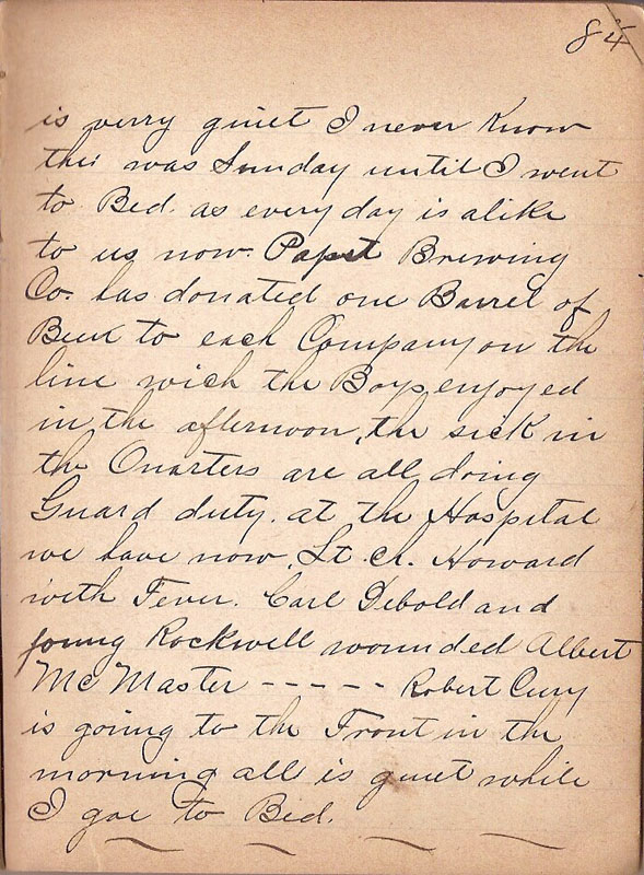| is very quiet I never Know this was Sunday until I went to Bed as everyday is alike to us now Papst Brewing Co. has donated one Barrel of Beer to each Company on the line wich the Boys enjoyed in the afternoon the sick in the Quarters are all doing Guard duty at the Hospital we have now Lt. Ch. Howard with Fever Carl Debold and Jourg Rockwell wounded Albert McMaster----- Robert Cury is going to the Front in the morning all is uiet while I goe to Bed. |
