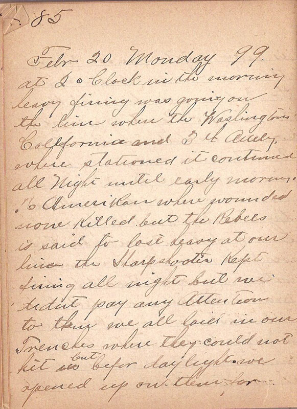 at 2 o Clock in the morning heavy firing was going on the line where the Washington California and 3th Atterly where stationed it continued all Night until early morning 16 Amerikan where wounded none Killed but the Rebels is said to lost heavy at our line the Sharpshooter Kept firing all night but we didnt pay any Attention to them we all laid in our Trenches where they could not hit us but befor daylight we opened up on them for |