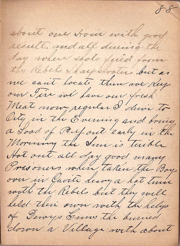 | about one Hour with good result and all during the day where shots fired from the Rebels Sharpshooters but as we cant locate them we Keep our Fire we have out fresh Meat now regular I drive to City in the Evening and bring a Load of Beef out early in the Morning the Sun is terrible Hot out all day good many Prisoners where taken the Boys over in Cavite havig a hot time with the Rebels but they will hold their own with the help of Dewys Guns the burned down a Village with about |