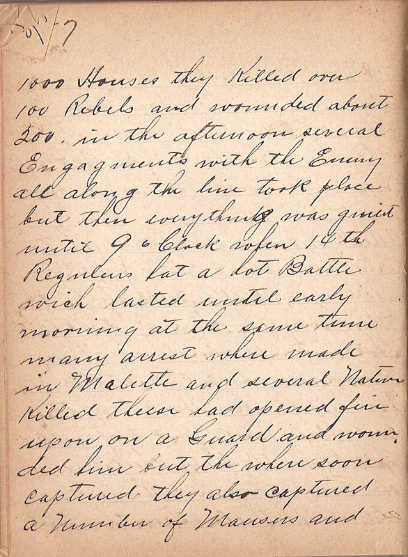 1000 Houses they Killed over 100 Rebels and wounded about 200 in the afternoon several Engagments with the Enemy all along the line took place but then everything was quiet until 9 o Clock when 14th Regulars hat a hot Battle wich laster until early morning at the same time many arrest where made in Malette and several Natives Killed theese had opened fire upon on a Guard and wounded him but the where soon captured they also captured a number of Mausers and |