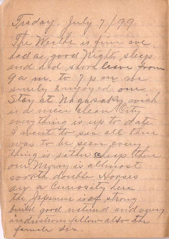 The Weathr is fine we had a good Night sleep and had shore leave from 9 am to 7 pm we surely enjoyed our Stay at Nagasaky wich is a niece clean City everything is up to date I went to sea all there was to be seen every thing is rather cheap there our Mony is allmost worth double Horses are a Curiosity here the Japanese is of strong build good natured and verry industrous fellow also the female sex |