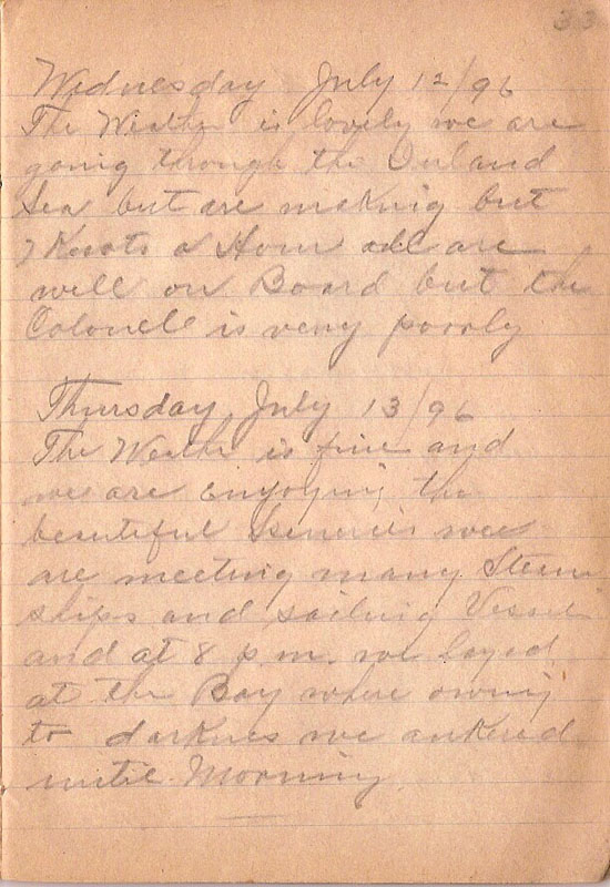 The day is fine we left at 4 am and everything is cleaned up the Sea is niece and calm we are running verry slow we have niese Senery on both Sides every one is delighted with the Trip |