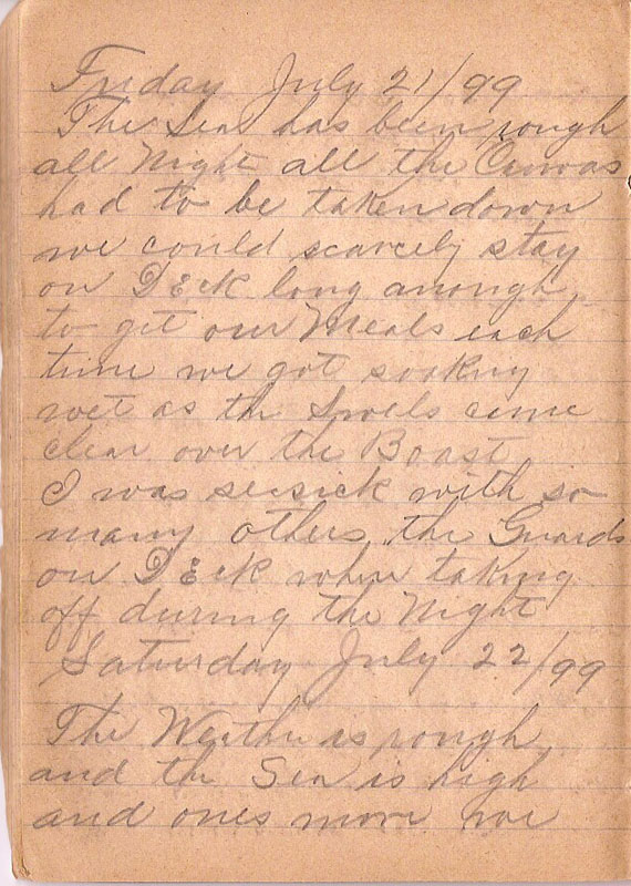 The Sea has been rough all Night all the Canvas had to be taken down we could scarcely stay on Deck long anough to get our Meals each time we got soaking wet as the Swels came clear over the Boast I was seasick with so many others the Guard on Deck where taking off during the Night