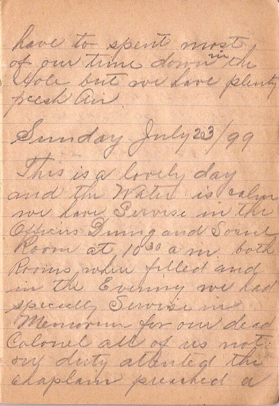 This is a lovely day and the Water is calm we have Servise in the Officers Dining and Sosrel Room at 1030 am both Room where filled and in the Evening we had specielly Servise in Memorium for our dead Colonel all of us not on duty attented the chaplain preached a