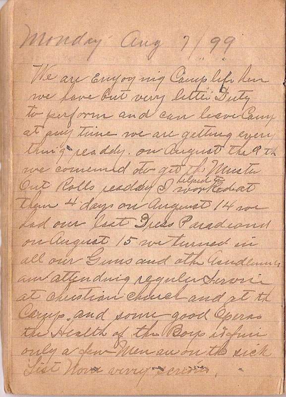 We are enjoying Camp life here we have but verry little Duty to perform and can leave Camp at any time we are getting every thing readdy on August the 9th we comenced to get the Muster Out Rolls readdy I helped to worked at them 4 days on August 14 we had our Guns and other Asudlunels am attending regular Service at christian church and at the Camp and some good Operas the Health of the Boys is fine only a few Men are on the sick List None verry serious |
