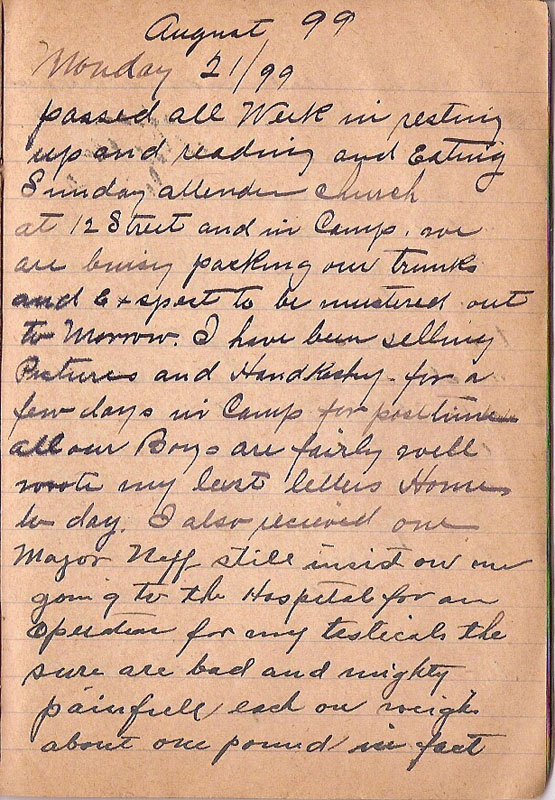 passed all Week in resting up and reading and eating Sunday attenden church at 12 Street and in Camp we are buisy packing our trunks and exspect to be mustered out to morrow I have been selling Pictures and Handkershif for a few days in Camp for pasttime all out Boys are fairly well wrote my last letters Home to day. I also recieved our Major Neff still insist on me going to the Hospital for an operation for my testicals the sure are bad and mighty painfull each on weigh about one pound in fact |
