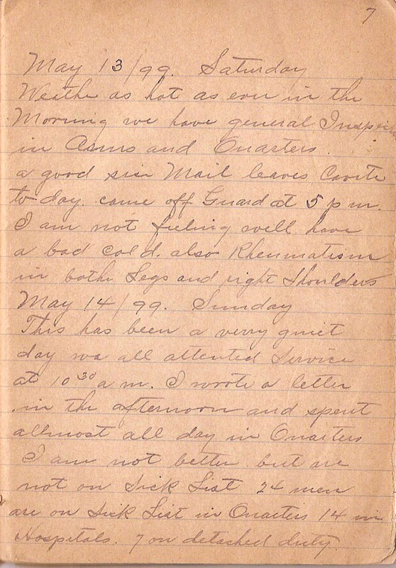 Weather is hot as ever in the Morning we have general Inspection in Arms and Quarters a good sin Mail leaves Cavite to day came off Guard at 5 pm. I cam not feeling well have a bad cold also Rheumatism in both Legs and right Shoulder