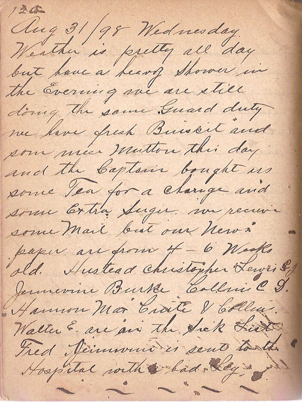 Weather is pretty all day but have a heavy Shower in the Evening we are still doing the same Guard duty we have fresh Buiscit and som nice Mutton this day and the Captain bought us some Tea for a change and some extra Sugar we receive some Mail but our News paper are from 4-6 Weeks old. Hustead christopher Lewis C.J. Jennewine Burke Collins C.D. Hannon Max Cuite & Collins Walter E are on the Sick List Fred Jennewine is sent to the Hospital with bad Leg |