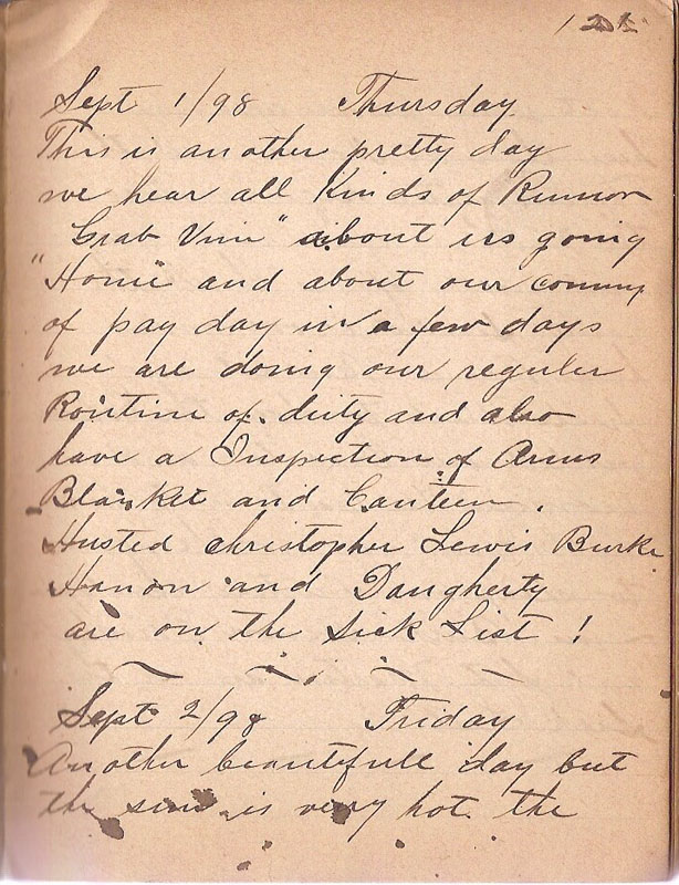 This is another pretty day we hear all kinds of Rumor "Grab Vein" about us going "Home" and about our coming of pay day in a few days we are doing our regular Routine of duty and also have a Inspection of Arms Blanket and Canteen Hustead christopher Lewis Burke Hanon and Daugherty are on the Sick List!
