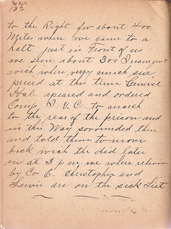 | to the Right for about 400 Miles where we came to a halt just in Front of us we seen about 300 Insurgent wich where verry much surprised at this time General Hale apeared and ordered Comp I & C to march to the rear of the prison and in this Way surrounded them and told them to move back wich the did later on at 3 pm. we where relived by Co E christopher and Lewis are on the sick List |