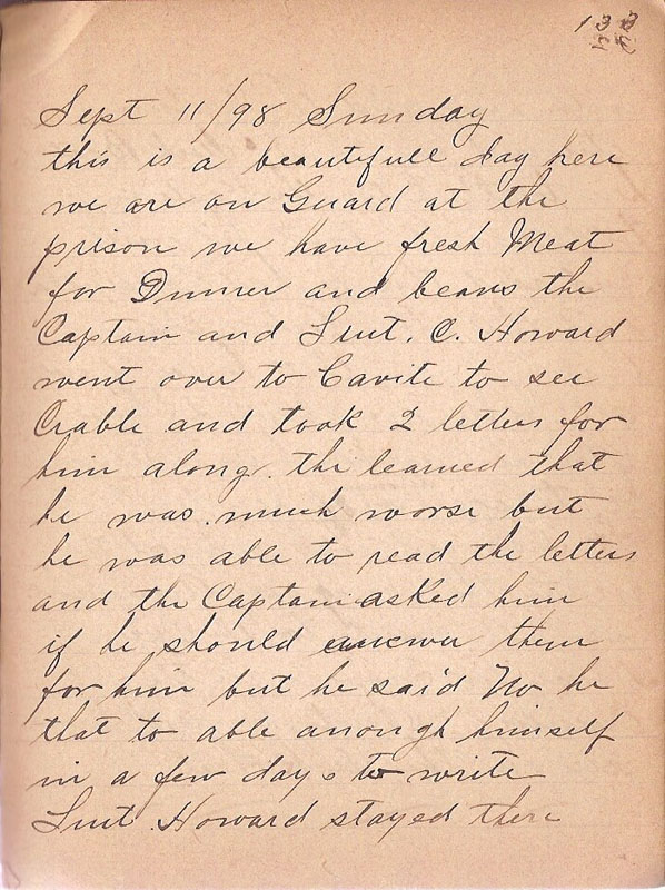 this is a beautifull day here we are on Guard at the prison we have had fresh Meat for Dinner and beans the Captain and Leut. C Howard went over to Cavite to see Crable and took 2 letters for him along the learned that he was much worse but he was able to read the letters and the Captain asked him if he should answer them for him but he said no he that to able enough himself in a few days to write Liut. Howard stayed there |