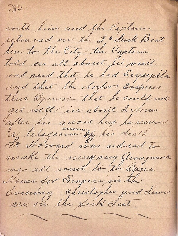 | with him and the Captain returned on the 2 o clock Boat here to the City the Captain told us all about his visit and said that he had Erysipila and that the doctors exspress their Opinoin that he could not get well in about 2 Hours after his arival here he recieved a telegram anouncing his death Lt Howard was ordered to make the nessasary Arangment we all went to the Opera House for Service in the Evening Christopher and Lewis are on the Sick List |